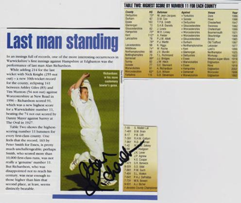 Signed cricket magazine feature on his ten wickets in an innings vs Derbys CCC.