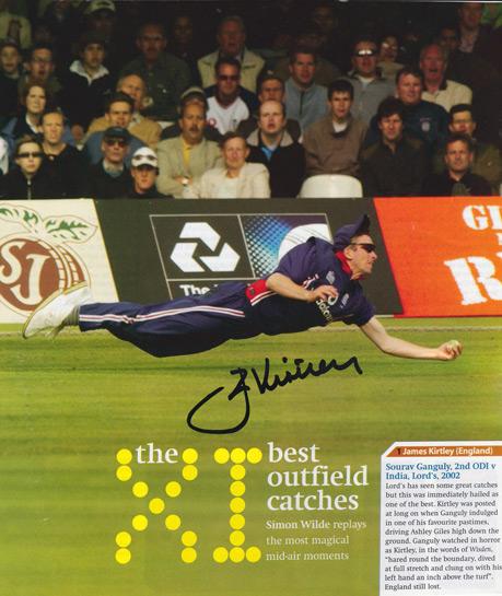 Signed Cricket magazine page featuring Kirtley amazing one-handed diving catch to dismiss Sourav Ganguly in a 2002 ODI v India at Lord's.