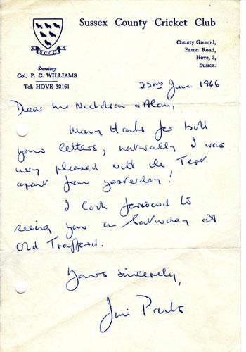 Hand-written & signed 1966 letter on Sussex CCC letterhead paper.