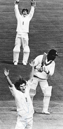 Signed B&W England Test match picture bowling against the West Indies in 1973.